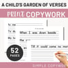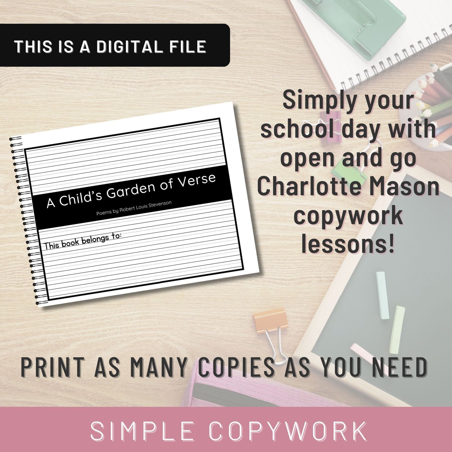 These copywork passages are selected from A Child’s Garden of Verses by Robert Louis Stevenson. They are in a 60-point print font with a blank line underneath for transcription and are designed to be used in a Charlotte Mason copywork lesson. A recitation practice sheet is included so you can easily combine recitation and copywork into one sitting or lesson time.