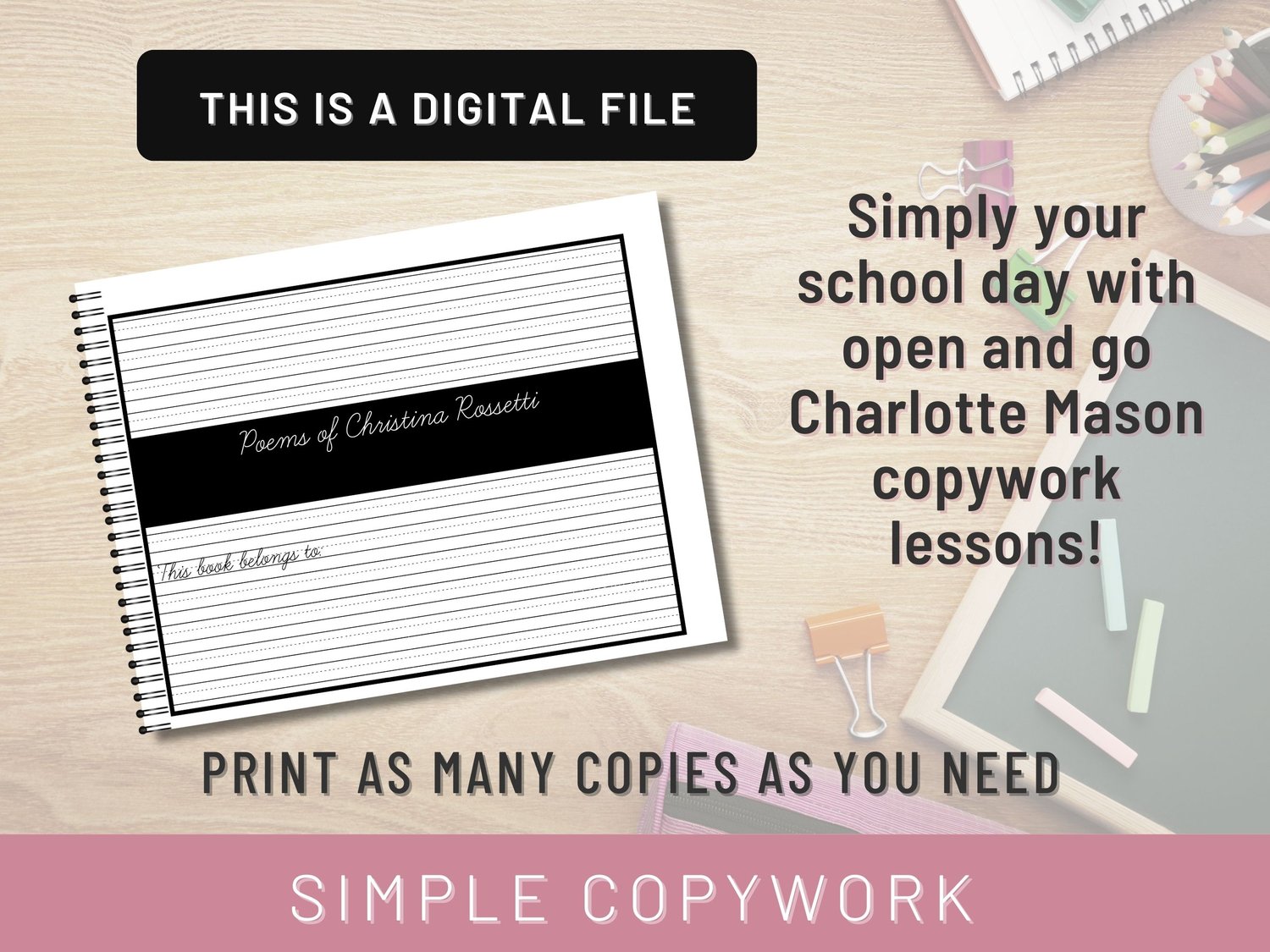 These copywork passages are selected from Christina Rossetti. They are in a 40-point CURSIVE font with a blank line underneath for transcription and are designed to be used in a Charlotte Mason copywork lesson. A recitation practice sheet is included so you can easily combine recitation and copywork into one sitting or lesson time.