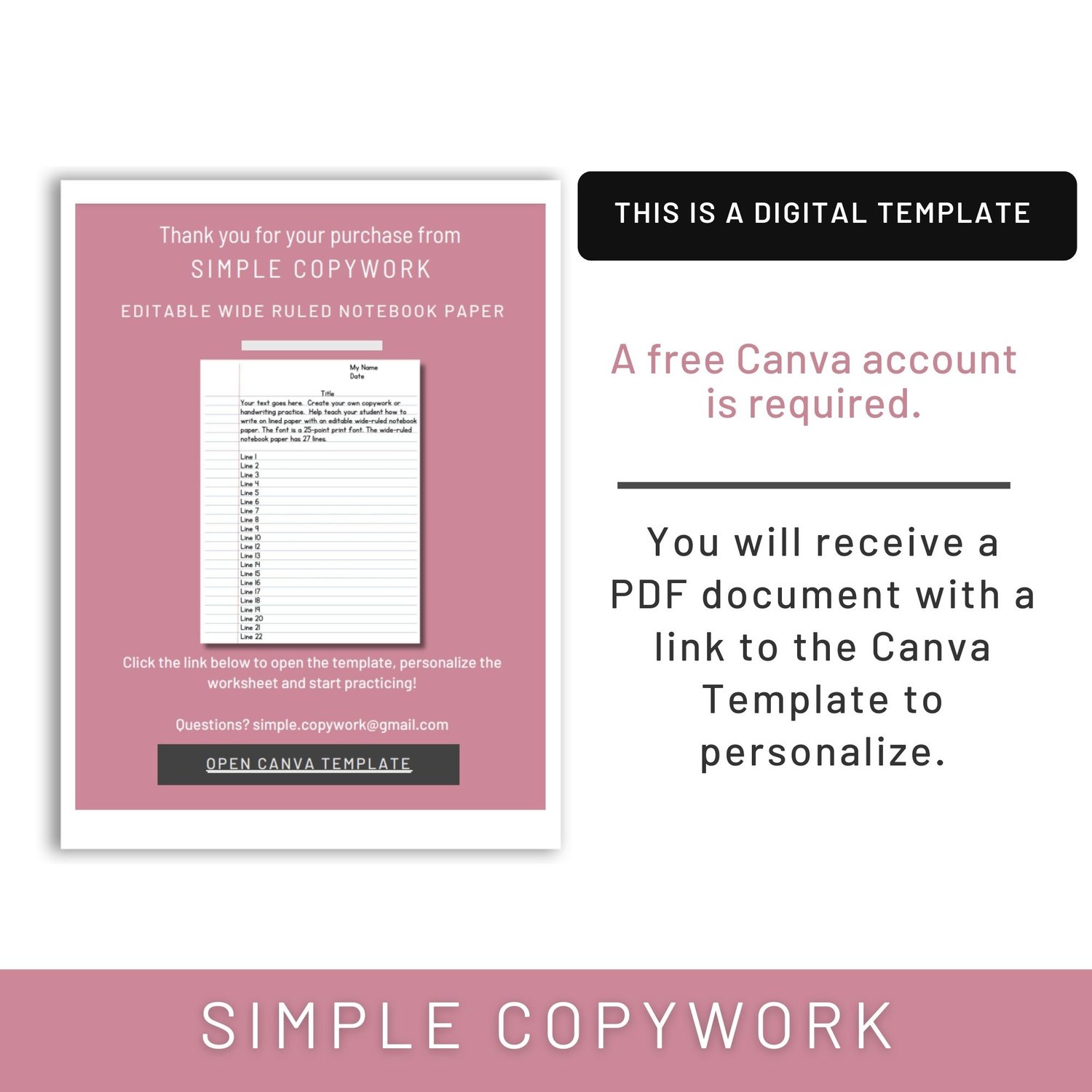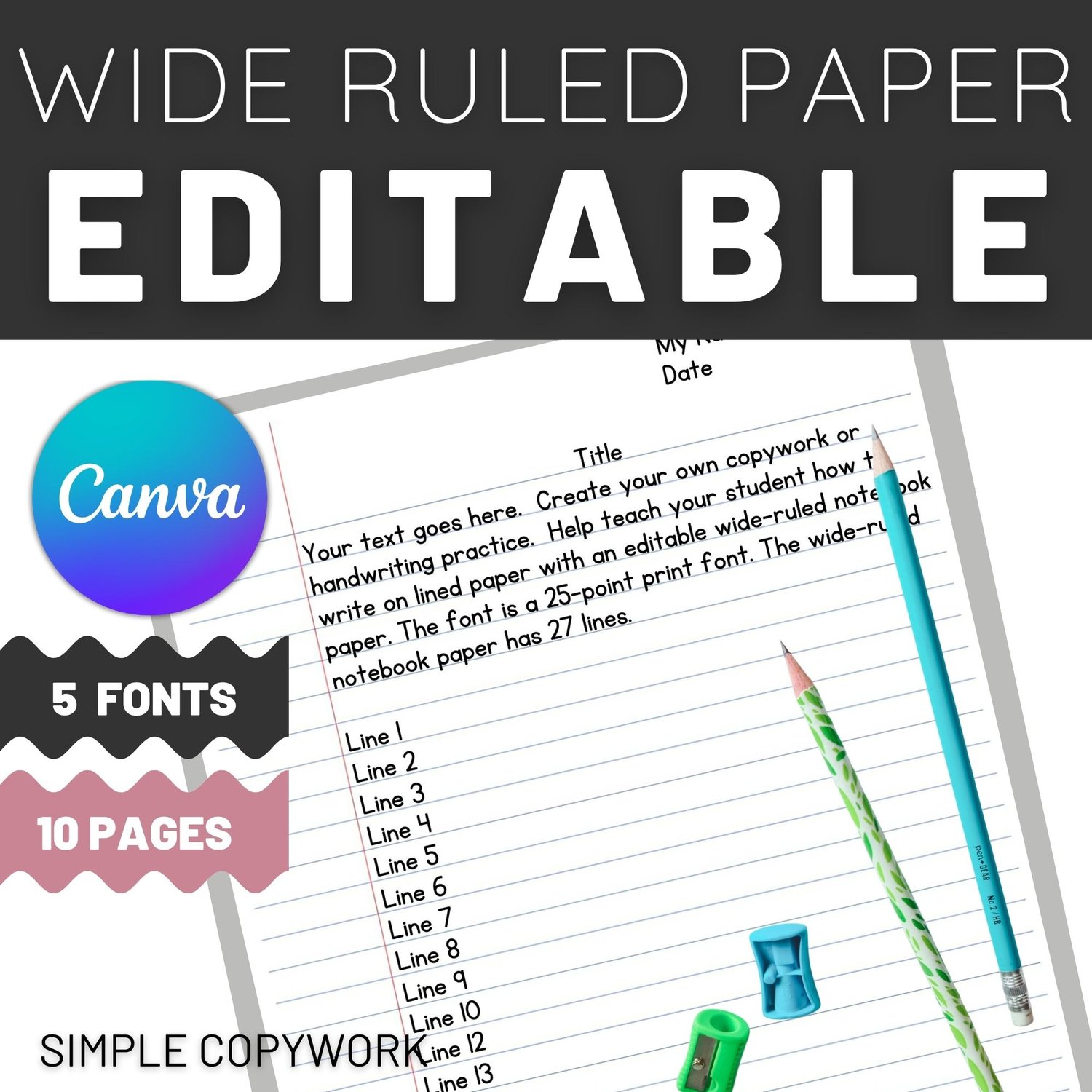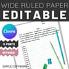 Looking to help your child practice handwriting on wide-ruled lined notebook paper in cursive, print, italics, and tracing fonts? Your search ends here with our Editable Wide Ruled Notebook Paper in Canva!